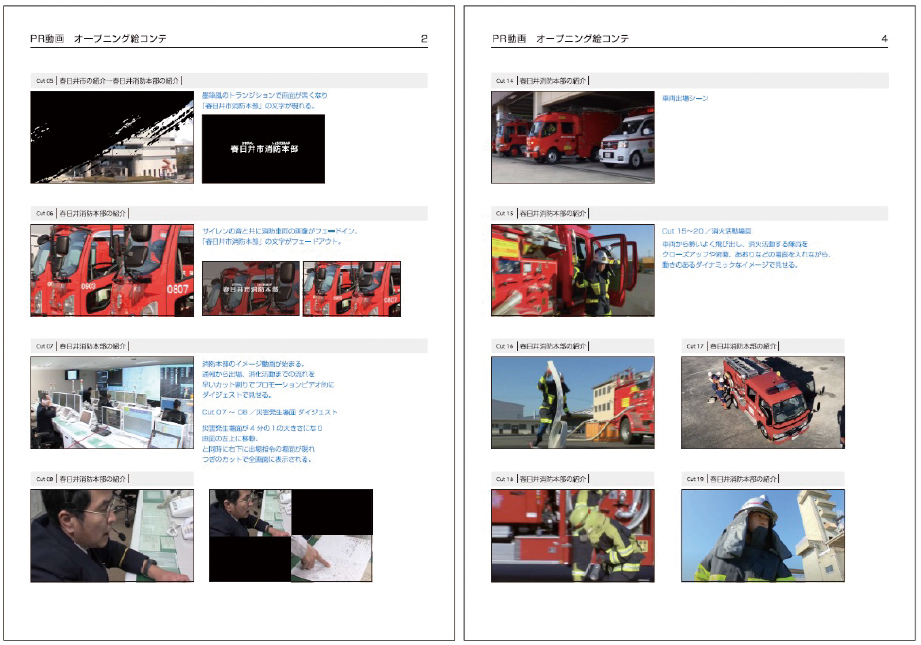 出動指令の緊迫した場面、多数傷病者事案への対応、放水訓練や救助活動など、多様な消防活動を盛り込み、絵コンテとシナリオを作成しました。地域イベントや教育用映像としても活用できる内容を意識しています。